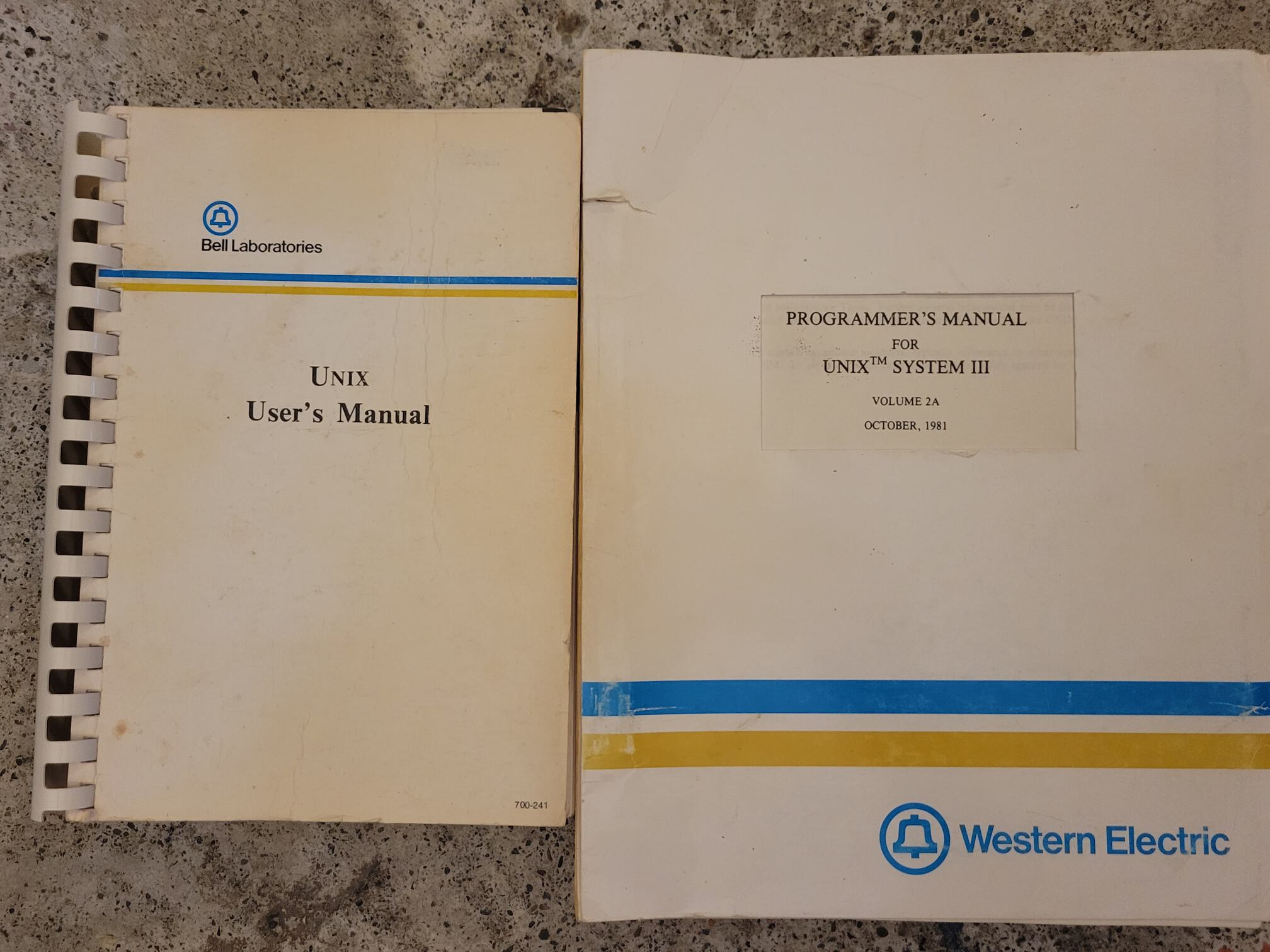 The above photographs capture the cover of the Bell Laboratories-branded UNIX User's Manual Release 3.0 and the Western Electric-branded Programmer's Manual for UNIX System III Volume 2A. Despite the contents in /usr/src/man/docs above suggesting the internal Release 3.0 documents were distributed like other versions in this line, as “Documents for UNIX”, it seems the Western Electric distribution of System III instead produced these papers as a “Programmer's Manual Volume 2” set.