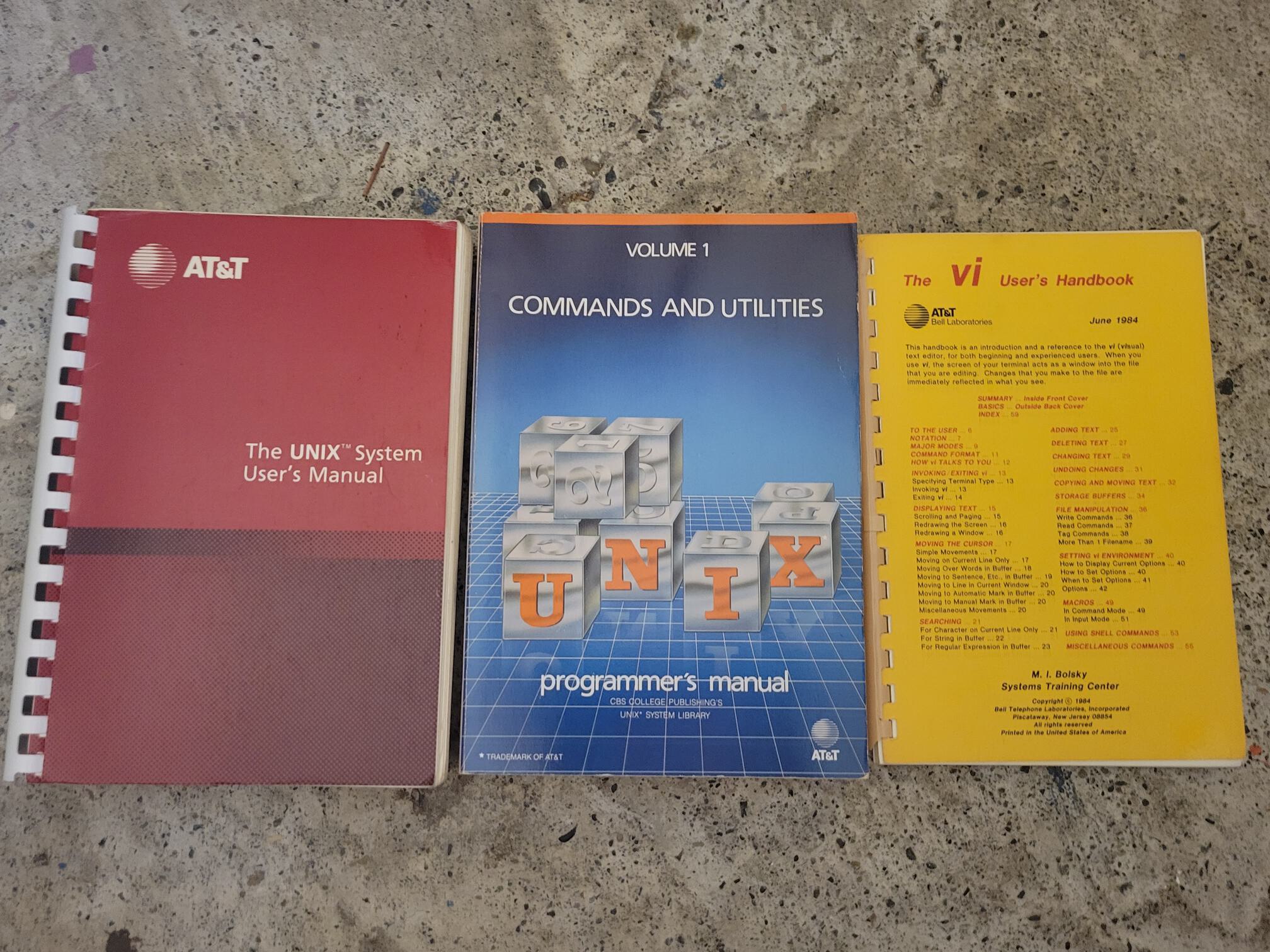 Pictured above are later System V R2 documents distributed by AT&T. The left bears a similar red cover motif to the binders AT&T was similarly distributing with 3B computers at the time. The middle document is a series of HRW-published “UNIX Programmer's Manual” documents, likely harkening back to the Seventh Edition manuals which were published as trade books previously. Finally, the right volume is part of a three volume set, published in small comb or wire bound form with striking yellow covers, concerning vi, C, and UNIX use in general. They're terse handbooks designed to be kept at one's desk for easy reference and are referred to on the back of the User's Manual on the left (along with a reference to a User's Guide, which is of a similar appearance to the manual but glue bound and green.)