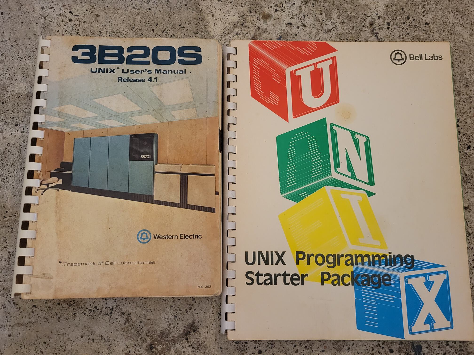 Pictured above are the UNIX User's Manual 4.1 3B20S and the UNIX Programming Starter Package. The former is the source of the reconstructed manual linked above and is thus far the only preserved UNIX 4.x manual. The latter is part of a pair of documents distributed by Bell Labs consisting of a subset of the Documents for UNIX collection listed above. The papers appear to be identical and are simply separated out for subject focus. This may represent the beginning of the further granularity in supporting document distributions seen starting with Release 5.0, making Documents for UNIX Release 4.0 the last such bundle in this lineage. Interestingly, this same falling blocks motif and document pair would continue to see distribution into the AT&T era, with versions of these documents with the AT&T death star logo appearing in the wild. It is presently unknown whether these AT&T branded sets still refer specifically to Release 4.0 or may have amendments.