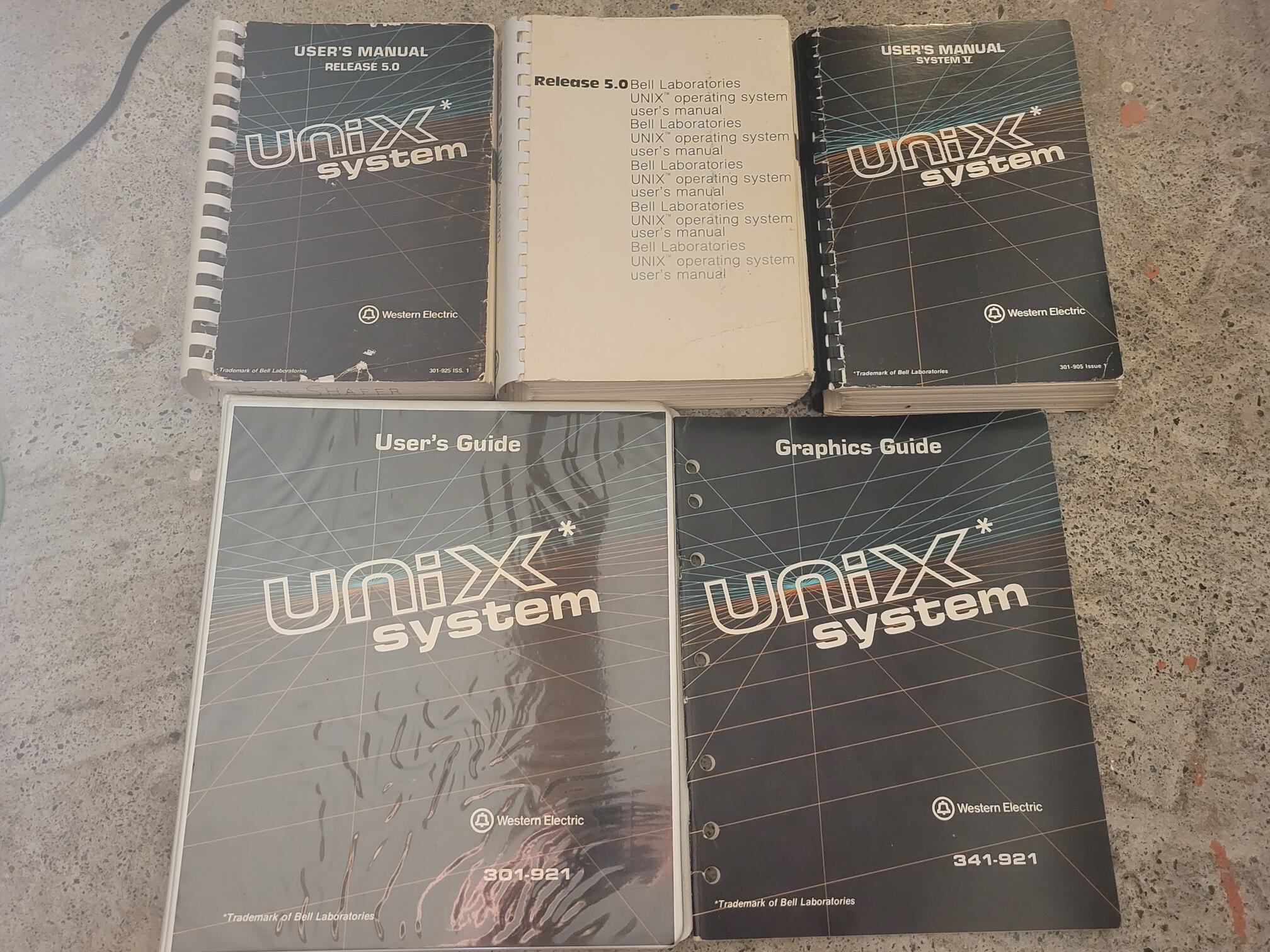 Pictured above are examples of various Release 5.0/System V documentation. The two variants of the general use manual flank the Bell Laboratories-specific manual on either side. All three User's Manuals have Administrator's Manual-equivalents. Additionally, an Error Message Manual is distributed in a similar comb bind. All of the Release 5.0 documents have their titles printed on their comb-binds, whereas previous generations were simply blank. As for System V, these have black comb bindings and thus no printing.