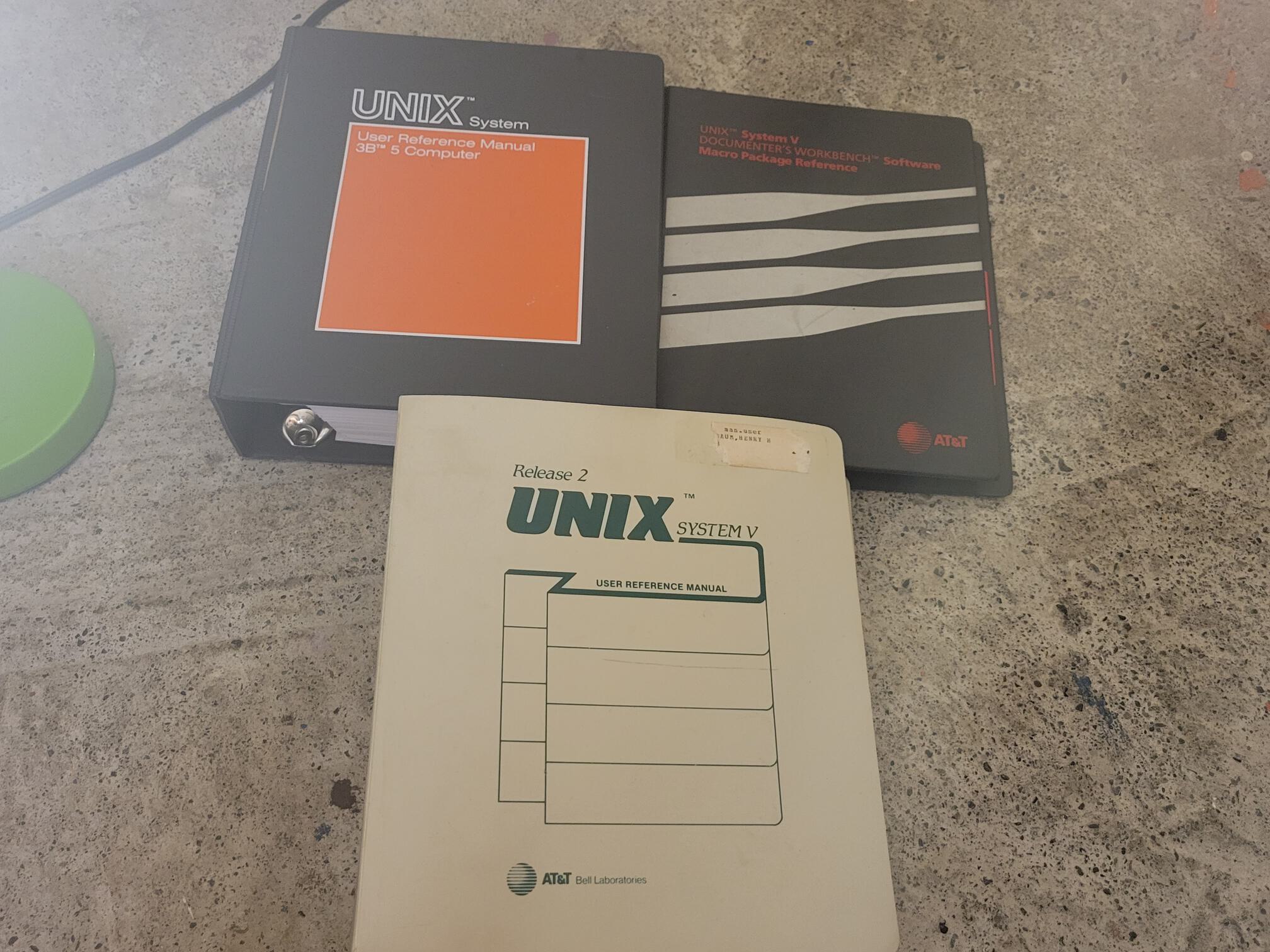 pictured above are early System V R2 documents distributed by Western Electric and AT&T. The upper left may represent System V R1 or R2, but in any case is targeting the 3B5 computer and presents a cover motif, a large orange square on a grey binder, that is visible in other Western Electric-branded binders of the time concerning UNIX and Documenters Workbench. In the upper right is a Documenter's Workbench binder displaying the typical motif of other UNIX System V R2 documents distributed publicly by AT&T at the time such as the User's Manuals for the DEC and 3B versions of SVR2. There were additionally small handbooks such as a vi handbook distributed with a similar grey AT&T death star motif at the time. Finally, the bottom binder is another Bell Laboratories-specific issue of System V. This binder is part of a set of 3 and represents the u_man portion of the binder. System V R2 features the further split-up of the u_man of previous manuals into u_man and p_man (Programmer's Manual) sections distributed separately. The other two BTL sections, Programmer's and Administrator's have thus far not been located or preserved.